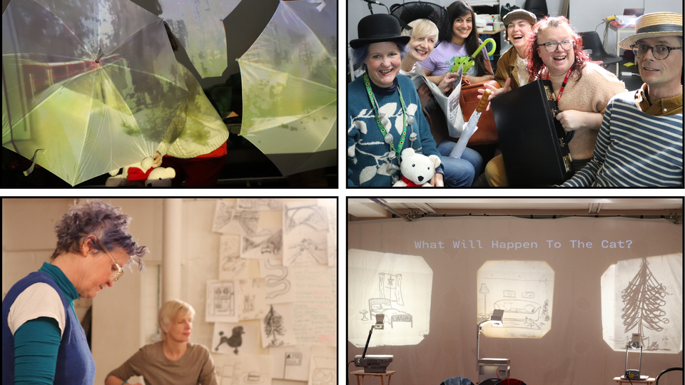 Vanishing Point is the working title of our next sensory non-verbal show made for and with people living with dementia. For a week we were resident in Scarborough at the Stephen Joseph Theatre, experimenting with objects, costume, smells, space, time, texture, temperature, projection, shadowplay – magicking story out of nowhere. We spent two afternoons learning about what the railways mean to people and gained an introduction, from people with lived experience, into young onset dementia. We came away with the bones of a new show that could tour in 2026/27.
